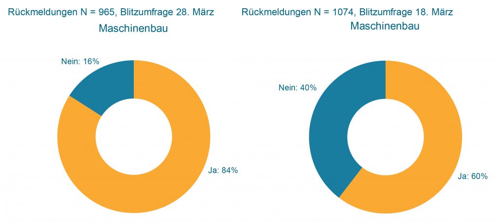 Deutlich skeptischer sind die Maschinenbauer inzwischen auch hinsichtlich der zu erwartenden Umsatzeinbußen. Knapp 96 Prozent der Unternehmen rechnen 2020 mit Umsatzrückgängen, die sie im Verlauf des Jahres nicht mehr kompensieren können. Gut 60 Prozent hiervon beziffern diese Rückgänge auf 10 bis 30 Prozent. In der Umfrage der vorangegangen beiden Wochen waren es noch 70 Prozent gewesen, die mit Umsatzeinbußen rechnen. Um diese abzufangen, haben bereits drei Viertel der befragten Maschinenbauer Kapazitätsanpassungen vorgenommen, überwiegend über das Arbeitszeitkonto, aber auch in Form von Einstellungsstopps und Kurzarbeit. „Personalabbau – auch von Teilen der Stammbelegschaft – ist für zwölf Prozent der Unternehmen bereits Thema“, erläutert Wiechers. Knapp drei Viertel der Betriebe erwägen aufgrund unsicherer Geschäftsaussichten und Liquiditätsengpässen eine Kürzung ihrer Investitionsvorhaben für 2020, die Hälfte im Bereich 10 bis 30 Prozent und etwa ein Viertel im Umfang von mehr als 50 Prozent. „Hier nachzuhelfen, sprich: die Investitionen wieder in Gang zu bekommen, wird eine der drängendsten Aufgaben für die Zeit nach Corona sein“, betont der VDMA-Chefvolkswirt.