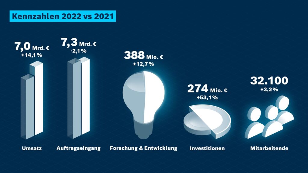 Bosch Rexroth hat im Geschäftsjahr 2022 mit 7Mrd.€ den höchsten Umsatz in der Unternehmensgeschichte erzielt. Gegenüber dem Vorjahr (6,2Mrd.€) stieg dieser um 14,1%. Die bisherige Höchstmarke von 2019 hat Bosch Rexroth damit um 849Mio.€ übertroffen. Die Region Amerika steuerte den größten Umsatzsprung (+34,8%) auf nun 1,4Mrd.€ bei. Europa außerhalb Deutschlands erzielte 2,4Mrd.€ (+16,5%). In Deutschland stieg der Umsatz um 11,3% auf 1,4Mrd.€. In Asien/Afrika/Australien fiel das Wachstum bei einem Umsatz von 1,8Mrd.€ am geringsten aus. Der Auftragseingang ging nur leicht zurück (-2,1%) auf 7,3Mrd.€ – den zweithöchsten Wert bisher. Investitionen in bestehende und neue Standorte (+53% auf 273Mio.€) sowie in Forschung & Entwicklung (388Mio.€ und 5,5% des Umsatzes) erreichten ebenfalls einen Höchststand. Ende 2022 beschäftigte Bosch Rexroth weltweit rund 32.100 Menschen, ein Plus von 3%.
