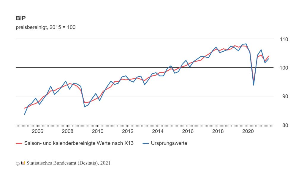 Das Bruttoinlandsprodukt (BIP) ist im 2. Quartal 2021 gegenüber dem 1. Quartal 2021 um 1,6% gestiegen. Im Vorjahresvergleich war das BIP im 2. Quartal preisbereinigt um 9,8% höher. Bedingt durch die zunehmenden Lockerungen im Rahmen der Corona-Pandemie wurde im 2. Quartal deutlich mehr konsumiert als zu Beginn des Jahres. Es wurde auch etwas mehr investiert als zu Jahresbeginn: Die Investitionen in Ausrüstungen – also vor allem in Maschinen, Geräte und Fahrzeuge – sind ,ebenso wie die Bauinvestitionen, um 0,3% gestiegen. Das verarbeitende Gewerbe verzeichnete im 2. Quartal einen Rückgang der Bruttowertschöpfung um 1,3%.