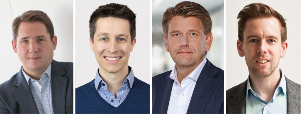 Cybus hat seinen Beirat neu formiert und mit Oliver Steil (2.v.r.), CEO von TeamViewer, und Dr. Felix Reinshagen (2.v.l.), CEO von NavVis, zwei Tech-CEOs berufen. Damit besteht der Beirat neben Steil und Reinshagen nun aus Holger Heinen (l.) als Beiratsvorsitzendem und Robert Gallenberger (r.), Gründungspartner und Geschäftsführer von Matterwave Ventures.