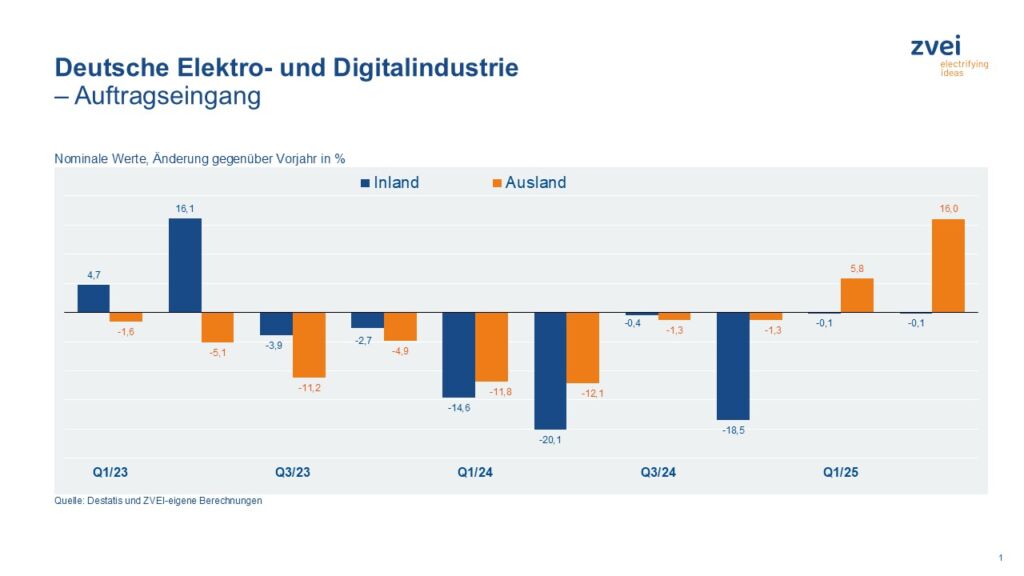 Im Juni konnte die deutsche Elektro- und Digitalindustrie abermals ein Plus bei den Auftragseingängen verbuchen. Insgesamt zogen sie hier um 10,3% gegenüber Vorjahr an. „Der zweistellige Zuwachs verdankt sich vor allem einigen Großaufträgen aus dem Ausland, wohingegen die Inlandsbestellungen um ein Fünftel hinter ihrem Vorjahreswert zurückblieben“, sagte ZVEI-Chefvolkswirt Andreas Gontermann. „So gaben die inländischen Bestellungen im Juni um 20,6% nach, während sich die Auslandsaufträge um 39,4% erhöhten. Dabei fiel der Anstieg bei den Orders aus Drittstaaten (+52,7%) deutlich kräftiger aus als bei jenen aus dem gemeinsamen Währungsraum (+12,6%). Das erste Halbjahr wurde mit einer Gesamtsteigerung bei den Bestellungen von 5,8% abgeschlossen. Die Orders aus dem Inland haben sich mit einem marginalen Rückgang von 0,1% zum gleichen Vorjahreszeitraum dabei kaum bewegt. Die Auslandsaufträge erhöhten sich hingegen von Januar bis Juni um 10,7%. Dabei war die Wachstumsrate mit 13,6% bei den Bestellungen von Kunden aus Drittstaaten mehr als doppelt so hoch wie bei Partnern aus der Eurozone, von denen immerhin 5,6% mehr Aufträge eingingen.