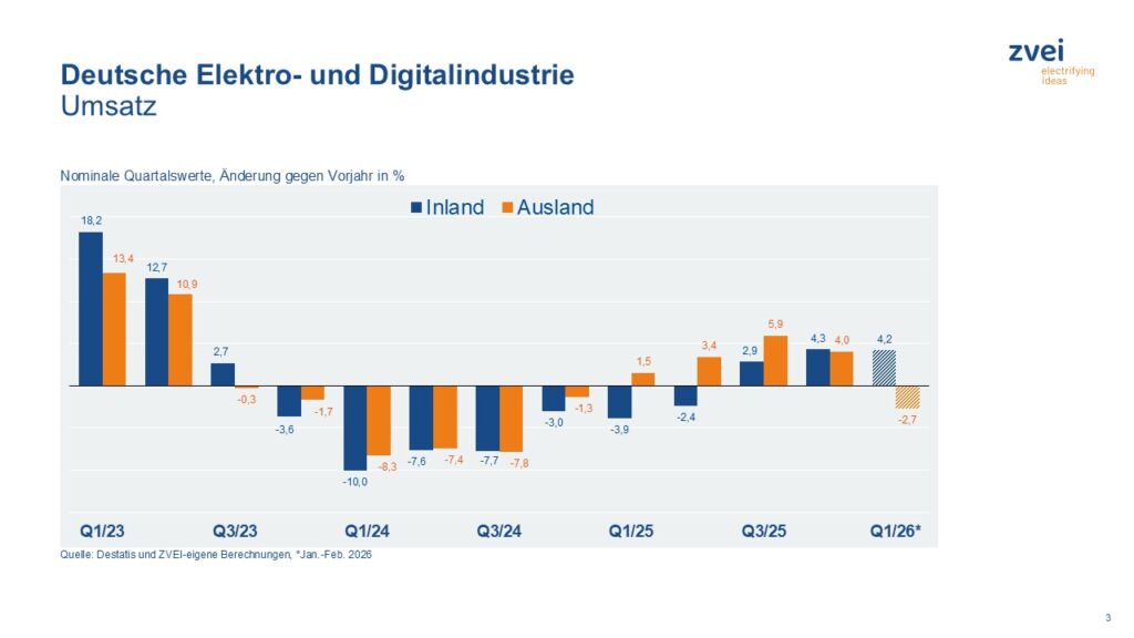 „Trotz des Iran-Kriegs ist das Geschäftsklima in der deutschen Elektro- und Digitalindustrie im März leicht gestiegen. Das lag vor allem an einer besseren Beurteilung der aktuellen Lage als noch im Februar. Die allgemeinen Geschäftserwartungen fielen dagegen leicht zurück”, analysiert Dr. Andreas Gontermann.