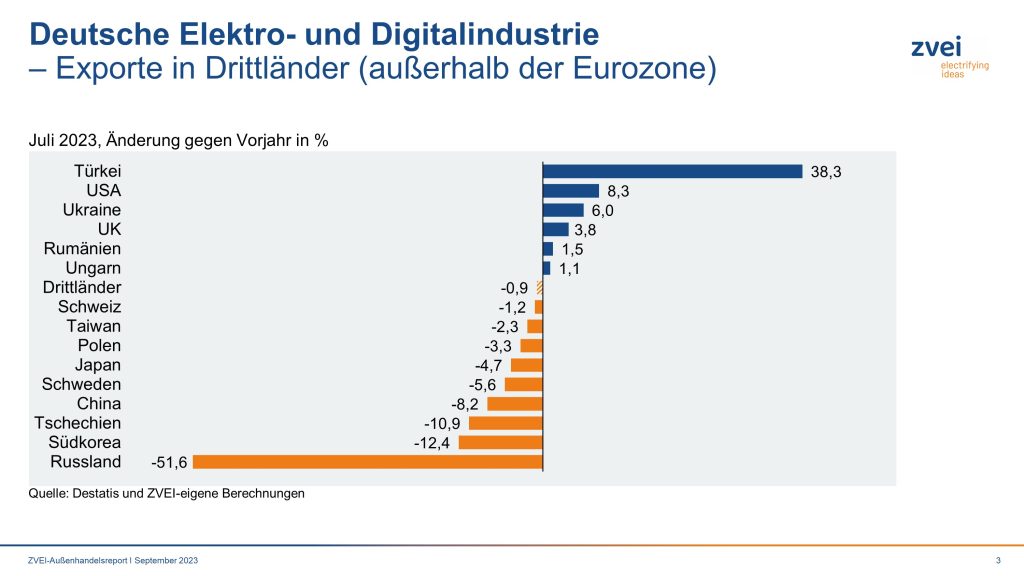 Die Branchenlieferungen in Drittländer sanken im Juli um 0,9% gegenüber Vorjahr auf 13,1Mrd.€. Ein kräftiges Plus gab es hier bei den Ausfuhren in die Türkei (+38,3% auf 391Mio.€). Auch für die Exporte in die USA (+8,3% auf 2,1Mrd.€), die Ukraine (+6% auf 46Mio.€), UK (+3,8% auf 756Mio.€), Rumänien (+1,5% auf 411Mio.€) und Ungarn (+1,1% auf 624Mio.€) wurden Zuwächse vermeldet. Dagegen gingen die Lieferungen in die Schweiz (-1,2% auf 663Mio.€), nach Taiwan (-2,3% auf 304Mio.€), Polen (-3,3% auf 885Mio.€), Japan (-4,7% auf 264Mio.€), Schweden (-5,6% auf 335Mio.€) und China (-8,2% auf 2,1Mrd.€) im Juli zurück. Sogar zweistellig fielen die Rückgänge bei den Exporten nach Tschechien (-10,9% auf 668Mio.€), Südkorea (-12,4% auf 270Mio.€) und Russland (-51,6% auf 45Mio.€) aus.