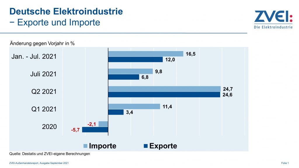Mit einem Wert von 18Mrd.€ verzeichneten die deutschen Elektroexporte im Juli ein Plus von 6,8% gegenüber Vorjahr. „Damit fiel der jüngste Zuwachs geringer aus als in den vier vorangegangenen Monaten, in denen – nicht zuletzt aufgrund von Basiseffekten – jeweils zweistellige Steigerungsraten erzielt worden waren“, sagte ZVEI-Finanzexperte Dr. Andreas Gontermann. In den gesamten ersten sieben Monaten dieses Jahres beliefen sich die aggregierten Branchenausfuhren auf 126,7Mrd.€, womit sie um 12% höher lagen als im Vorjahr. Mit 16,6Mrd.€ übertrafen die Importe elektrotechnischer und elektronischer Erzeugnisse nach Deutschland ihr Vorjahresniveau im Juli um 9,8%. Auch hier nahm das Expansionstempo ab. Kumuliert von Januar bis Juli rangierten die Einfuhren bei 121Mrd.€ und damit 16,5% über Vorjahr. Die Elektroexporte in die Industrieländer kamen im Juli auf 11,5Mrd.€ (+8,1% gegenüber Vorjahr). Hier gab es die höchsten Zuwächse bei den Lieferungen nach Taiwan (+18,3% auf 216Mio.€) und Südkorea (+17,8% auf 262Mio.€). Die Ausfuhren nach Tschechien (+14,7% auf 801Mio.€), Italien (+13,5% auf 920Mio.€), in die Niederlande (+13,2% auf 886Mio.€) und nach Schweden (+12,9% auf 387Mio.€) zogen ebenfalls zweistellig an. Auch mit Österreich (+9,3% auf 779Mio.€), Großbritannien (+8,2% auf 746Mio.€), den USA (+7,4% auf 1,7Mrd.€), Spanien (+4% auf 569Mio.€), der Schweiz (+1,7% auf 634Mio.€) und Frankreich (+0,7% auf 1Mrd.€) gab es mehr Geschäfte. Dagegen waren die Ausfuhren nach Belgien (-3,4% auf 360Mio.€), Dänemark (-5,3% auf 211Mio.€) und Japan (-6,1% auf 217Mio.€) im Juli rückläufig. In den ersten sieben Monaten wuchsen die Exporte in die Industrieländer um 13,1% gegenüber Vorjahr auf 81,5Mrd.€. „Die Elektroausfuhren in die Gruppe der Schwellenländer kamen zuletzt langsamer voran als die Branchenlieferungen in die Industrieländer“, so Gontermann. „Sie erhöhten sich im Juli nur um viereinhalb Prozent gegenüber Vorjahr auf 6,5Mrd.€. “Das größte Plus gab es bei den Exporten nach Südafrika, die um 53,3% auf 118Mio.€ zunahmen. Ebenfalls kräftig wuchsen die Lieferungen nach Brasilien (+43,3% auf 121Mio.€) und Indien (+39,7% auf 196Mio.€). Bei den Ausfuhren nach Ungarn (+9,9% auf 568Mio.€), Malaysia (+7,2% auf 199Mio.€), Thailand (+7% auf 86Mio.€), China (+5,3% auf 2,1Mrd.€), Rumänien (+4,9% auf 335Mio.€) und Mexiko (+4,6% auf 213Mio.€) waren jeweils einstellige Zuwächse zu verzeichnen. Die Elektroexporte nach Polen (+0,1% auf 829Mio.€) lagen im Juli auf Vorjahresniveau, die nach Russland (-0,6% auf 356Mio.€) leicht und jene in die Türkei (-20,9% auf 227Mio.€) deutlich darunter. Von Januar bis Juli beliefen sich die aggregierten Branchenausfuhren in die Schwellenländer auf 45,2Mrd.€ – ein Plus von 10,2% gegenüber Vorjahr.