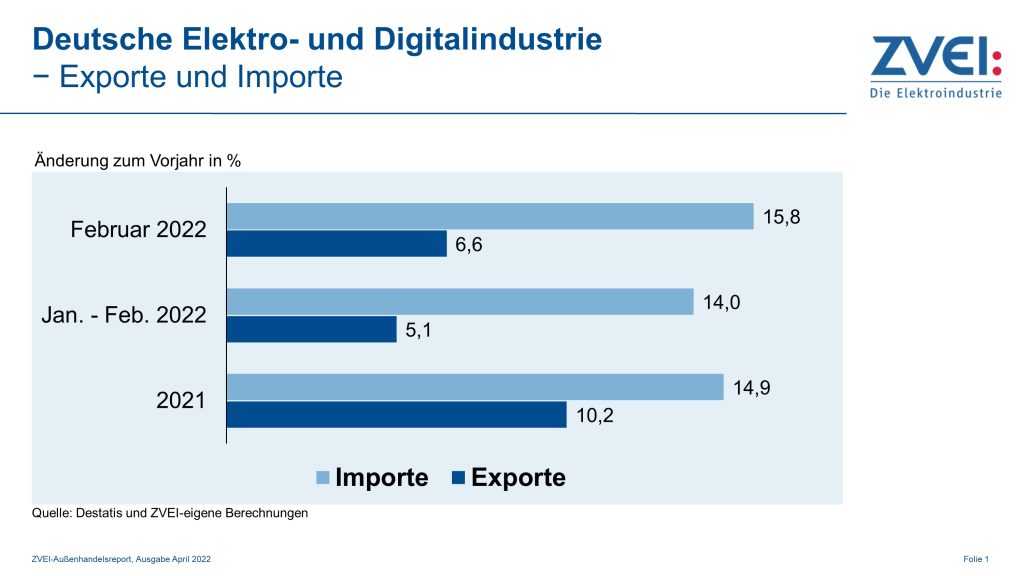 Die Exporte der deutschen Elektro- und Digitalindustrie sind im Februar 2022 weiter gestiegen: Mit einem Zuwachs von 6,6% gegenüber Vorjahr kamen sie auf einen Wert von 18,4 Milliarden Euro. „Auswirkungen des Ukraine-Kriegs spiegeln sich in diesen Zahlen noch nicht wider, diese werden erst ab dem nächsten Berichtsmonat erkennbar sein“, so ZVEI-Finanzexperte Dr. Andreas Gontermann. In den ersten beiden Monaten dieses Jahres erhöhten sich die aggregierten Branchenausfuhren um 5,1% gegenüber Vorjahr auf 36,1 Milliarden Euro.