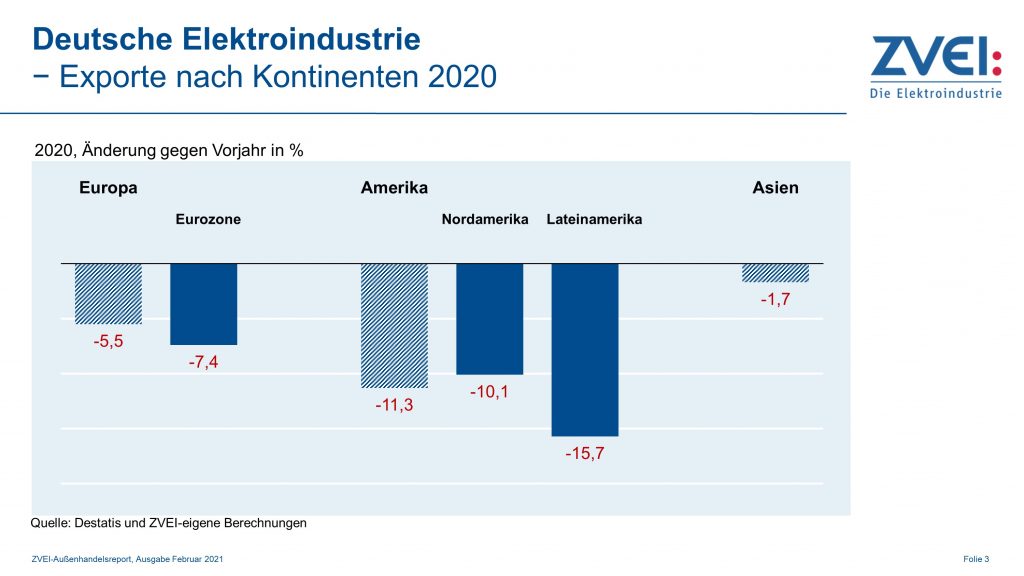 Die insgesamt negative Entwicklung der deutschen Elektroexporte 2020 spiegelt sich auch beim Blick auf die Ausfuhrwerte in die einzelnen Kontinente wider, wenn auch unterschiedlich stark ausgeprägt. So gingen die Branchenausfuhren nach Asien mit minus 1,7% auf 46,1Mrd.€ letztes Jahr nur vergleichsweise leicht zurück – freilich nicht zuletzt getragen vom Exportgeschäft mit China. Im Gegensatz dazu sanken die Lieferungen nach Europa im vergangenen Jahr um 5,5% auf 129,3Mrd.€, wobei die Ausfuhren in die Eurozone stärker rückläufig waren (-7,4% auf 63,3Mrd.€). Damit wurden 2020 rund 64% der deutschen Elektroexporte nach Europa und 31% in den Euroraum verschickt. Die Elektroausfuhren nach Amerika sackten 2020 um 11,3% auf 23,1Mrd.€ ab. Dabei brachen die Exporte nach Lateinamerika (-15,7% auf 4,6Mrd.€) noch stärker weg als die nach Nordamerika (-10,1% auf 18,5Mrd.€).