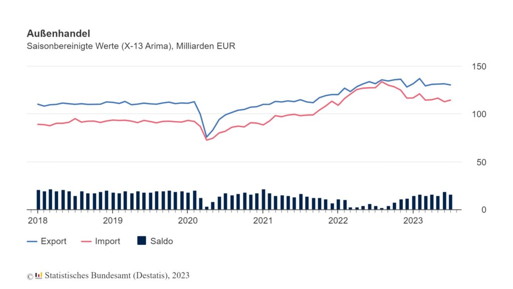 Im Juli sind die deutschen Exporte gegenüber Juni kalender- und saisonbereinigt um 0,9% gesunken und die Importe um 1,4% gestiegen. Wie das Statistische Bundesamt anhand vorläufiger Ergebnisse mitteilt, sanken die Exporte im Vergleich zum Vorjahresmonat Juli 2022 um 1% und die Importe um 10,2%. Insgesamt wurden im Juli kalender- und saisonbereinigt Waren im Wert von 130,4Mrd.€ aus Deutschland exportiert und Waren im Wert von 114,5Mrd.€ nach Deutschland importiert. Die Außenhandelsbilanz schloss im Juli mit einem Überschuss von 15,9Mrd.€ ab.