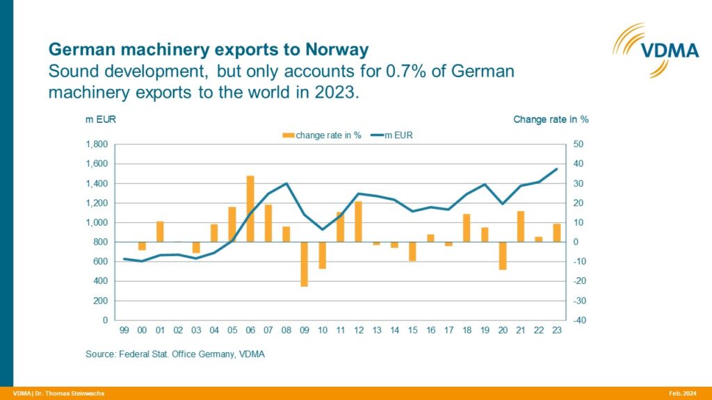 Norwegen ist das diesjährige Partnerland der Hannover Messe. Der VDMA hat das zum Anlass genommen, ein paar Konjunkturdaten zusammenzutragen. Das Gesamtvolumen des norwegischen Maschinenmarktes erreichte im vergangenen Jahr 11Mrd.€, woran der Anteil der Importe 83,7% betrug. Deutschland war 2023 mit einem Marktanteil von 14,9% der wichtigste Lieferant, gefolgt von Schweden (9%), dem Vereinigten Königreich (6,3%) und Italien (6,2%). Die deutschen Maschinenexporte nach Norwegen erreichten im Jahr 2023 einen Wert von 1,5Mrd.€ – ein deutlicher Zuwachs von 9,4% zum Vorjahr. Das nordeuropäische Land lag damit auf Rang 27 der Exportrangliste. Im Jahr 2022 waren die Ausfuhren um 2,8% gewachsen. Die wichtigsten Sektoren der deutschen Maschinenexporte nach Norwegen waren die Fördertechnik (238Mio.€/+41%) gefolgt von Landmaschinen (177Mio.€/+18%), Bau- und Baustoffmaschinen (145Mio.€/+15%), die Lufttechnik (99Mio.€/+41%) sowie Nahrungsmittel- und Verpackungsmaschinen (75Mio.€/-6%).