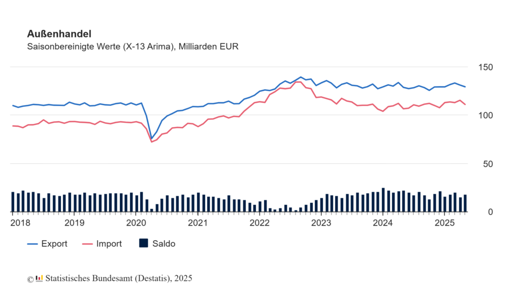 Im Mai wurden kalender- und saisonbereinigt Waren im Wert von 129,4Mrd.€ aus Deutschland exportiert und Waren im Wert von 111,1Mrd.€ nach Deutschland importiert. Die Außenhandelsbilanz schloss damit im Mai mit einem Überschuss von 18,4Mrd.€ ab. Im April hatte der kalender- und saisonbereinigte Saldo der Außenhandelsstatistik +15,7Mrd.€ betragen. Im Mai 2024 hatte er bei +22,3Mrd.€ gelegen.