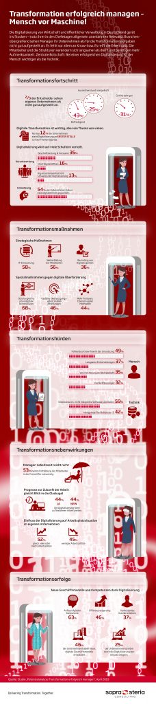 Die deutsche Wirtschaft droht, sich bei der Digitalisierung zu verzetteln. Für nur 12% der Unternehmen ist der digitale Umbau die wichtigste Aufgabe. 81% stufen die Digitalisierung zwar immer noch als wichtig ein, der digitale Umbau gilt aber inzwischen als eine Aufgabe unter vielen. Einer der Gründe: erst wenige positive Effekte auf das Wachstum. Trotz digitaler Anstrengungen steigerte erst ein Viertel der befragten Unternehmen dadurch seinen Umsatz. Zu diesem Ergebnis kommt die Studie ‚Potenzialanalyse Transformation erfolgreich managen‘ von Sopra Steria Consulting. Dafür wurden 354 Manager, Führungskräfte und Spezialisten aus verschiedenen Bereichen befragt. Viele Unternehmen stecken im Digitalisierungsprozess fest. Obwohl 46% schon jetzt digitale Geschäftsmodelle entwickelt haben, ist die Mehrheit mit dem bis heute Erreichten nicht zufrieden. 69% benoten das eigene Unternehmen mit ‚befriedigend‘ oder schlechter, wenn es um die Frage geht, wie gut der Betrieb auf die digitale Transformation vorbereitet ist. 59% geben zu, dass ausgerechnet die durch nicht integrierte Software und Daten fortbestehenden Silos zu den größten Hindernissen gehören. Jedes zweite Unternehmen beklagt außerdem, dass das notwendige Knowhow fehlt, um die digitale Transformation zu meistern. 42% bemängeln eine IT, die nicht flexibel genug ist, um sie für die neuen Aufgaben fit zu machen. Zudem leiden 37% unter zu langsam getroffenen Entscheidungen und teilweise unter zu vielen Beteiligten sowie einer starren Hierarchie.