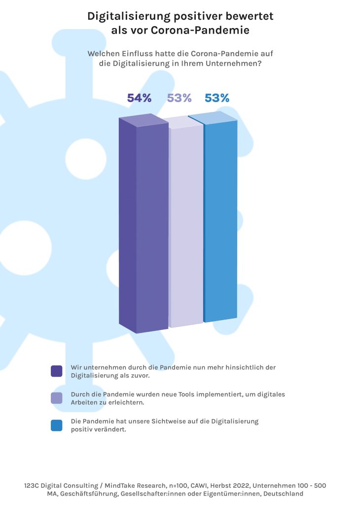 Laut einer aktuellen Studie des Beratungsunternehmens 123C Digital Consulting unter 100 Geschäftsführern und Eigentümern von B2B-Unternehmen sagen mehr als die Hälfte der Befragten (54%), dass sie seit Corona ihre Digitalisierung stärker vorantreiben als zuvor. Konkret haben sie u.a. in neue Tools investiert (53%), um digitales Arbeiten zu erleichtern. Auch die Sichtweise hat sich für die Mehrheit geändert. So erklären ebenfalls 53%, dass sie die Digitalisierung innerhalb des Unternehmens positiver wahrnehmen. 42% geben an, durch die Pandemie mehr Zeit gewonnen zu haben, um sich Digitalisierungsthemen zu widmen. Parallel hat die Pandemie allerdings bei 48% das Geschäftsvolumen reduziert – was den geplanten digitalen Fortschritt gleichzeitig hemmt. Bei genauerer Nachfrage wird deutlich, dass hierfür primär finanzielle Engpässe verantwortlich waren (43%).
