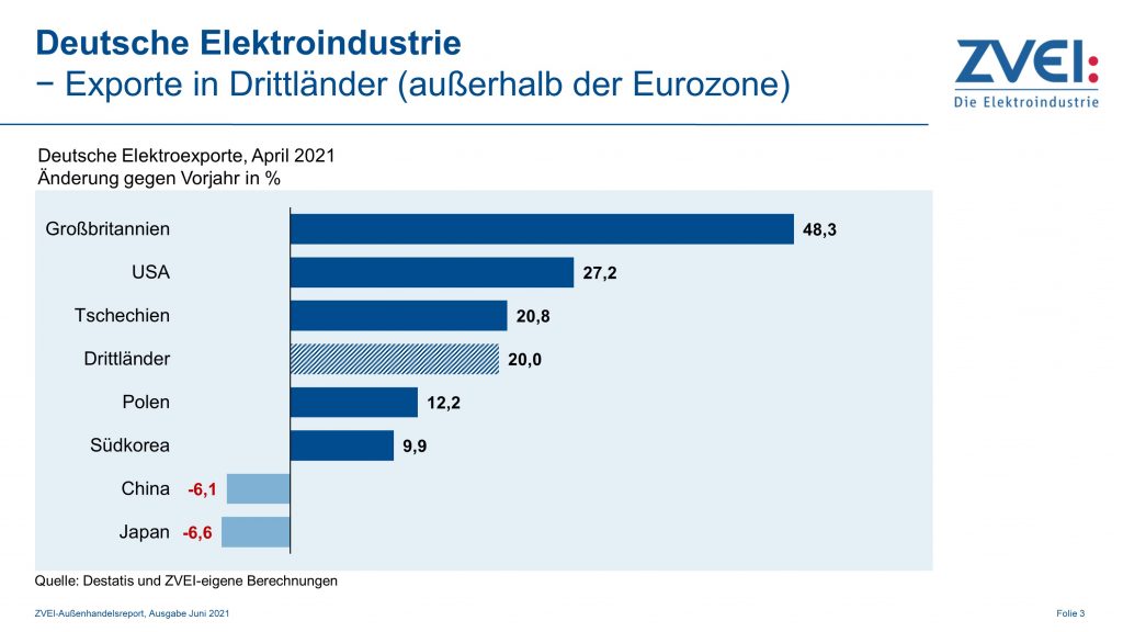 Zwar stiegen die heimischen Elektroexporte in die Gesamtheit der Länder außerhalb des Euroraums im April dieses Jahres um ein Fünftel (+20%) gegenüber dem Vorjahr auf 11,7Mrd.€. Allerdings verlief das Geschäft mit den einzelnen Ländern hier sehr unterschiedlich. So stiegen die Ausfuhren nach Großbritannien – wo die Vorjahreswerte nicht nur von der Pandemie, sondern auch durch den Brexit beeinträchtigt waren – im April um 48,3% auf 685Mio.€. Die Lieferungen in die USA legten um 27,2% auf 1,5Mrd.€ zu. Bei den Exporten in die beiden osteuropäischen Länder Tschechien und Polen waren Zuwächse von 20,8% (auf 816Mio.€) bzw. 12,2% (auf 802Mio.€) zu vermelden. Die Lieferungen nach Südkorea erhöhten sich um 9,9% auf 236Mio.€. Dagegen gab es bei den Ausfuhren nach China (-6,1% auf 2Mrd.€) und Japan (-6,6% auf 206Mio.€) im April Rückgänge. Kumuliert von Januar bis April beliefen sich die Lieferungen in die Drittländer auf 48,4Mrd.€. Das ist ein Plus von 5,4% gegenüber dem Vorjahr.
