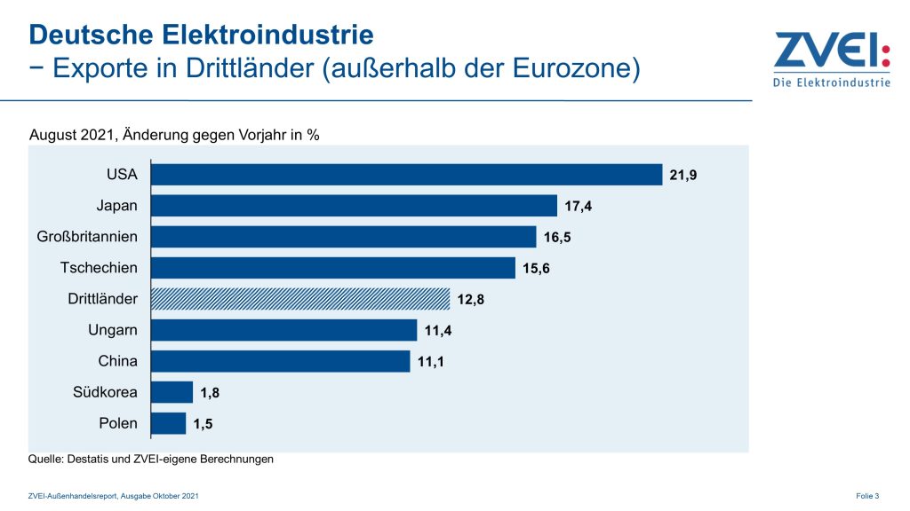 Bei den Elektroausfuhren in die Länder außerhalb der Eurozone wurde im August ein Plus von 12,8% gegenüber Vorjahr auf 12,3Mrd.€ vermeldet. Unter den Drittländern entwickelten sich insbesondere die Exporte in die USA, dem zweitgrößten ausländischen Abnehmer der deutschen Elektroindustrie, positiv. Sie erhöhten sich um +21,9% auf 1,7Mrd.€. Auch die Ausfuhren nach Japan (+17,4% auf 243Mio.€), Großbritannien (+16,5% auf 745Mio.€), Tschechien (+15,6% auf 782Mio.€), Ungarn (+11,4% auf 569Mio.€) und China (+11,1% auf 2,1Mrd.€) zogen zweistellig an. Demgegenüber legten die Branchenlieferungen nach Südkorea (+1,8% auf 256Mio.€) und Polen (+1,5% auf 859Mio.€) nur leicht zu. Von Januar bis August rangierten die aggregierten Elektroexporte in Drittländer bei 98Mrd.€ (+10% gegenüber Vorjahr).