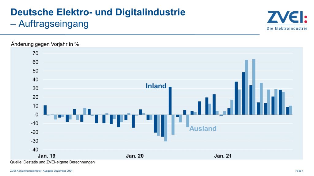 Über den Gesamtzeitraum von Januar bis Oktober dieses Jahres erzielte die deutsche Elektro- und Digitalindustrie ein Bestellplus von knapp einem Viertel (+ 24,5%). Hier wuchsen die Inlandsaufträge um 19,8% gegenüber Vorjahr und die aus dem Ausland um 28,4%. Aus dem Euroraum gingen in den ersten zehn Monaten 26% mehr Bestellungen ein als im gleichen Vorjahreszeitraum, aus Drittländern waren es 29,8% mehr.