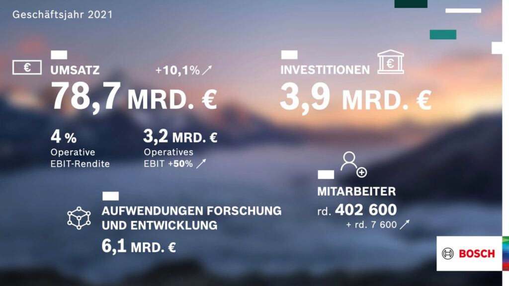 Im Geschäftsjahr 2021 erzielte Bosch Erlöse in Höhe von 78,7Mrd.€. Das sind 10% mehr als im Vorjahr. Zu dem Ergebnis haben alle Unternehmensbereiche beigetragen. Nach Regionen betrachtet lag Europa knapp 9% im Plus. In Nordamerika stiegen die Erlöse um 6,5%. In Südamerika wurden +32% erzielt. Im Raum Asien-Pazifik wuchs der Umsatz um 13%.