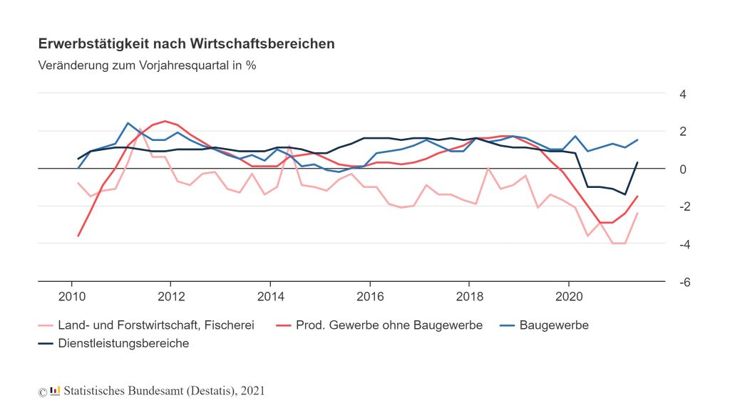 Im 2. Quartal 2021 waren rund 44,7 Millionen Personen mit Arbeitsort in Deutschland erwerbstätig. Nach vorläufigen Berechnungen des Statistischen Bundesamtes stieg die Erwerbstätigenzahl im Vergleich zum Vorquartal saisonbereinigt um 75.000 Personen (+0,2%), nachdem sie im 1. Quartal 2021 noch zurückgegangen war (-43.000 Personen; -0,1%). Sie lag damit aber weiterhin deutlich unter dem Vorkrisenniveau: 2. Quartal 2021 waren saisonbereinigt 1,2% oder 564.000 Personen weniger erwerbstätig als im 4. Quartal 2019, dem letzten Quartal vor Beginn der Einschränkungen aufgrund der Corona-Pandemie.