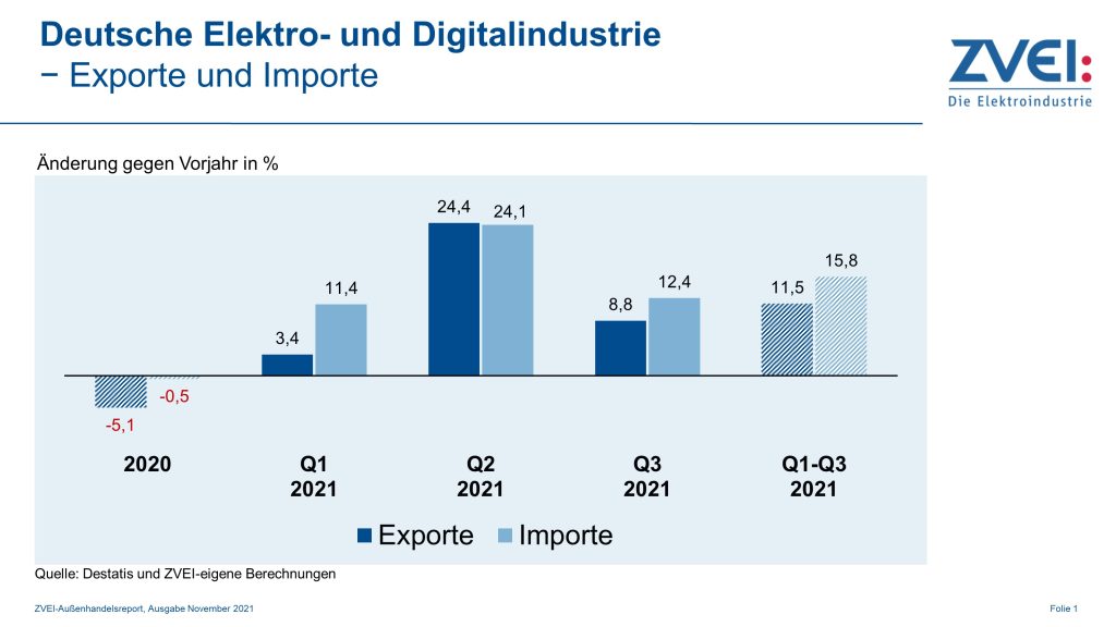 Im September kamen die Exporte der deutschen Elektroindustrie auf 19,1Mrd.€. Damit lagen sie 6% über ihrem Vorjahreswert. In den gesamten ersten drei Quartalen dieses Jahres stiegen die aggregierten Branchenausfuhren stärker um 11,5% gegenüber dem entsprechenden Vorjahreszeitraum auf 165,3Mrd.€. „Der Zuwachs entsprach damit den Steigerungsraten bei Produktion und Umsatz“, sagte ZVEI-Finanzexperte Dr. Andreas Gontermann. Die Einfuhren elektrotechnischer und elektronischer Erzeugnisse nach Deutschland beliefen sich im September auf 18,3Mrd.€. Hier wurde der Wert aus dem Vorjahr um 14% übertroffen. Für die ersten neun Monate steht bei den Elektroimporten ein Plus von 15,8% gegenüber Vorjahr auf insgesamt 159,3Mrd.€ in den Büchern. Weitere Grafiken zu den aktuellen Zahlen der deutschen Elektroindustrie finden Sie auf Seite 5 des Automation Newsletters.