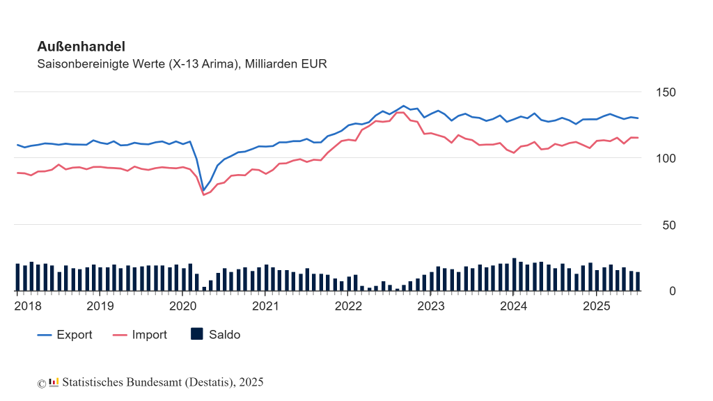 Im Juli wurden kalender- und saisonbereinigt Waren im Wert von 130,2Mrd.€ aus Deutschland exportiert und Waren im Wert von 115,4Mrd.€ nach Deutschland importiert. Die Außenhandelsbilanz schloss damit im Juli mit einem Überschuss von 14,7Mrd.€ ab. Im Juni hatte der kalender- und saisonbereinigte Saldo der Außenhandelsstatistik +15,4Mrd.€ betragen.