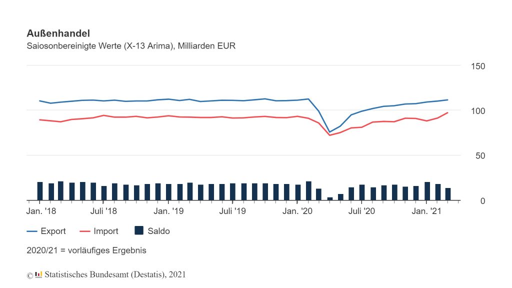 Im März 2021 wurden von Deutschland Waren im Wert von 126,5 Milliarden Euro exportiert und Waren im Wert von 105,9 Milliarden Euro importiert. Im Vergleich zum Vorjahresmonat März 2020 stiegen die Exporte im März 2021 um 16,1% und die Importe um 15,5%. Damit wurde export- und importseitig nominal der jeweils höchste je gemessene Monatswert in der Außenhandelsstatistik verzeichnet.