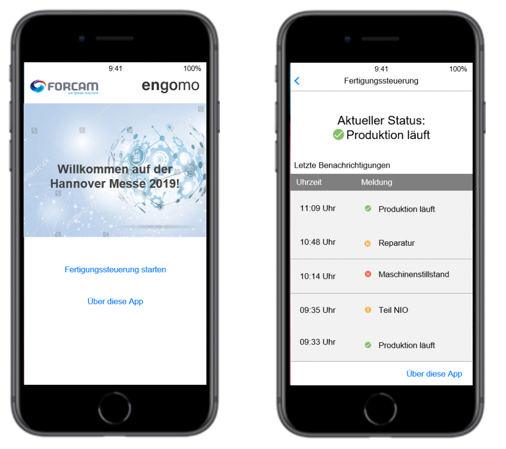 Die technologischen Veränderungen und Innovationen stellen immer wieder neue Anforderungen, auch an die Produktion. Neben Flexibilität sind auch kurze Reaktionszeiten auf Kundenwünsche ein wichtiger Erfolgsfaktor. Dazu gehören neben Termintreue und dem Einhalten der Lieferzeiten auch minimierte Rüstzeiten und individualisierte Produkte. Eine mobile App für die Fertigungsplanung und -steuerung kann diese Vorgänge erleichtern. Engomo hat auf der Hannover Messe am Stand von Forcam demonstriert, wie leicht es ist, ohne besonderen Programmieraufwand Smartphone-, Tablet- und Smartwatch-Apps für die Fabrik herzustellen. Die Fabrik-App informiert Nutzer per Push-Nachricht in Echtzeit über alle wichtigen Ereignisse, wie z.B. über ein mangelhaftes Teil oder einen Maschinenstillstand. Ebenso können Informationen zu Auftragsübersichten, dem aktuellen Produktionsstatus oder erforderliche Einsatzmaterialen abgerufen werden.