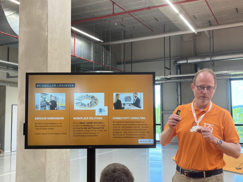 Nach dem Einblick in die Megatrends ging es darum, welche konkreten technischen Lösungen Weidmüller für diese bereithält. Im Rahmen praxisorientierter Workshops konnten sich die anwesenden Journalistinnen und Journalisten selbst davon ein Bild machen. Erster Fokus war die Effizienz im Schaltschrankbau. Die Teilnehmer bestückten eine Hutschiene mit diversen Komponenten per Hand und stellten die entsprechenden Markierungen mit teilautomatisierten Gerätschaften her, erlebten aber auch, welches Potenzial in den vollautomatischen Lösungen wie Rail Assembler bzw. Rail Laser steckt. Für alle, die eine Investition in eine solch automatisierte Lösung noch scheuen, bietet das Unternehmen seinen Fast Delivery Service an. Mit dem Rail Snapper, der im vergangenen Jahr den SSB Innovation Award gewonnen hat, wurde anschließend die konfektionierte Hutschiene auf die Montageplatte aufgebracht. In einer Verdrahtungs-Challenge konnten die Medienvertreter zudem den Zeitaufwand der Snap-In-Technologie im Vergleich mit anderen Verdrahtungsverfahren testen. Im Workshop rund um die Maschinenverkabelung ging es um die Zusammenarbeit mit der Firma Eplan und deren Cable ProD-Software. Zudem bot sich die Gelegenheit, einen schweren HDC-Steckverbinder selbst zu verdrahten sowie zu montieren, und es gab ein Update in Sachen Single Pair Ethernet.