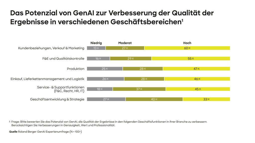 „Die Zeit ist reif für GenAI, aber viele Unternehmen sind es noch nicht. Es herrscht Aufregung in der Arbeitswelt, denn mittlerweile ist es offensichtlich, dass GenAI viel mehr als nur ein Hype ist. GenAI muss als transformative Technologie, als Quantensprung betrachtet werden, die alle Branchen überall verändern wird. Unternehmen, die auf diese Entwicklung nicht rechtzeitig reagieren, riskieren, den Anschluss zu verlieren. Die Geschwindigkeit und das Ausmaß der Veränderungen sind beispiellos“, bekräftigt Jochen Ditsche, Partner bei Roland Berger. Funktionsübergreifend hohe Erwartungen an das Potenzial von GenAI