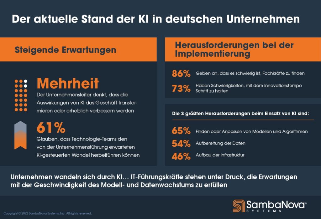 Eine von SambaNova in Auftrag gegebene Umfrage unter Führungskräften in Deutschland und Großbritannien beleuchtet die größten Herausforderungen in Unternehmen beim Einsatz von KI. Dazu gehören u.a. das Anpassen von Modellen und Algorithmen (65%), das Einrichten der Infrastruktur (46%) und die Aufbereitung der Daten (54%).