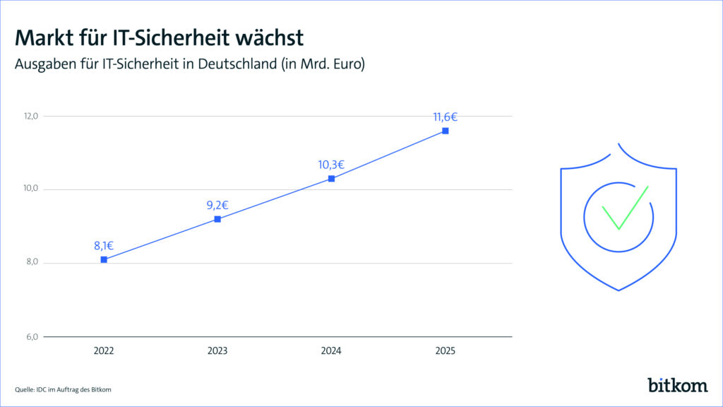 Erstmals werden in der deutschen Wirtschaft für IT-Sicherheit in diesem Jahr mehr als 9Mrd.€ ausgegeben. Das sind 13% mehr als Vorjahr. Im kommenden Jahr wird ein erneuter Anstieg um rund 13% auf 10,3Mrd.€ erwartet. Das teilte der Digitalverband Bitkom mit. „Zuletzt ist deutschen Unternehmen durch Sabotage, Spionage und Datendiebstahl ein jährlicher Schaden von 206Mrd.€ entstanden, davon 148Mrd.€ durch Cyberattacken“, sagt Bitkom-Hauptvorstand Udo Littke. Den größten Anteil an den Aufwendungen haben Ausgaben für IT-Sicherheitssoftware mit rund 4,3Mrd.€ (+18%). Knapp dahinter liegen Aufwendungen für Dienstleistungen rund um IT-Sicherheit, die um 12% auf 4Mrd.€ zulegen. Unverändert weitere knapp 0,9Mrd.€ entfallen auf IT-Sicherheits-Hardware.