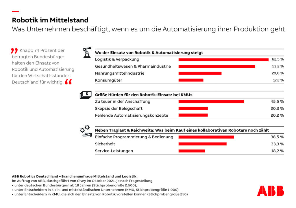Eine von ABB im Auftrag gegebene Umfrage zum Stand der Automatisierung im deutschen Mittelstand lässt erkennen: Robotik und Automatisierung werden besonders stark im Logistiksektor (62,5%) ansteigen. Großes Potenzial bescheinigen die Befragten auch der Pharmaindustrie (29,9%) und dem Gesundheitswesen (23,3%) sowie der Nahrungsmittelbranche (29,8%). Demgegenüber stehen Vorbehalte – etwa Kostenaspekte (45,5%), eine hohe Skepsis bei den Mitarbeitenden (20,3%) sowie fehlende Automatisierungskonzepte (20,2%). Von den befragten KMUs, die bereits über eine robotergestützte Automatisierung nachdenken, legen 38,5% Wert auf eine einfache und leichte Programmierung. Eine hohe Sicherheit ist für ein Drittel der Befragten wichtig.
