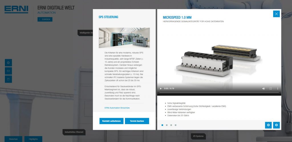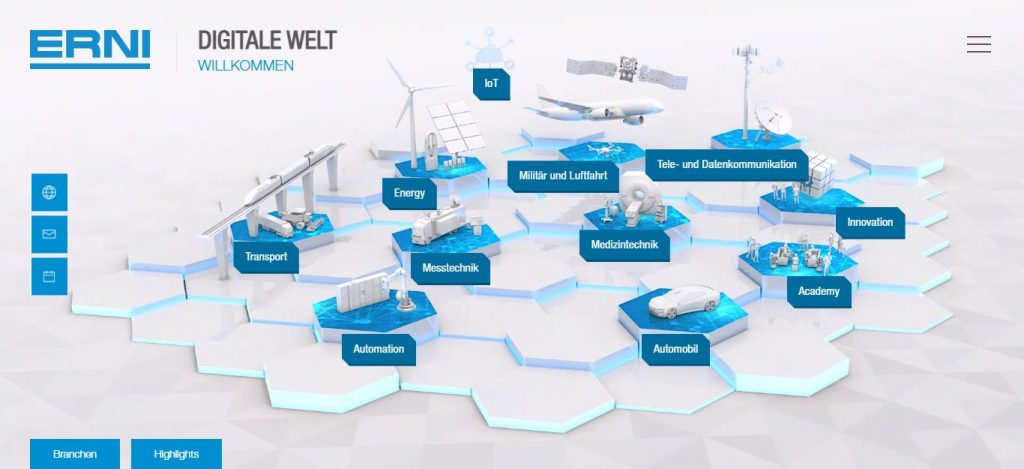 Erni bietet ab sofort mit der neu konzipierten Digitalen Welt eine Präsentations- und Service-Plattform für Anwender, die sich ganz gezielt für Themen und Lösungen rund um ihr spezifisches Anwendungsumfeld bzw. ihre Branche interessieren. Die Erni Welt ist in den Sprachen Deutsch, Englisch und Chinesisch verfügbar und ermöglicht Interessenten, sich möglichst schnell und einfach über das für sie passende Produkt zu informieren. Wie in einer virtuellen Ausstellung kann der Kunde sein jeweiliges Themengebiet ansteuern und findet neben Lösungsvorschlägen zur Anwendung auch Produktinformationen und weiterführende Links. Zu den einzelnen Themengebieten gehören z.B. Präsentationsplattformen rund um die Automation, den Automotive-Sektor, das Transportwesen oder die Mess- und Prüftechnik. Das responsive Webdesign ermöglicht den Zugang zur Digitalen Erni Welt und die Nutzung der Funktionen auf allen mobilen Geräten.