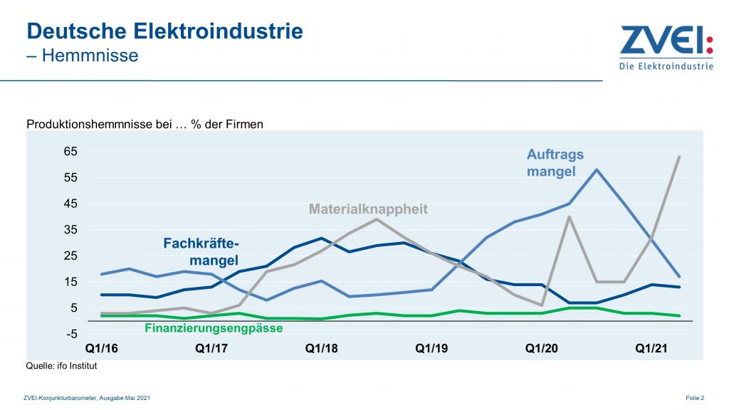Die Produktion elektrotechnischer und elektronischer Erzeugnisse hat ihren Vorjahreswert im 1. Quartal 2021 um 3,1% übertroffen. Die Kapazitätsauslastung ist zu Beginn des 2. Quartals 2021 auf 86,7% der betriebsüblichen Vollauslastung gestiegen und liegt damit jetzt mehr als 10% höher als vor einem Jahr. Gleichzeitig weitete sich die Reichweite der Auftragsbestände auf 3,8 (Produktions-)Monate aus. Die Produktionspläne blieben im April gegenüber März unverändert expansiv. Derweil verlagern sich die Produktionshemmnisse weiter zunehmend auf die Angebotsseite. So litten zuletzt nur noch 17% der Firmen unter Auftragsmangel, aber 63% unter Materialknappheit.