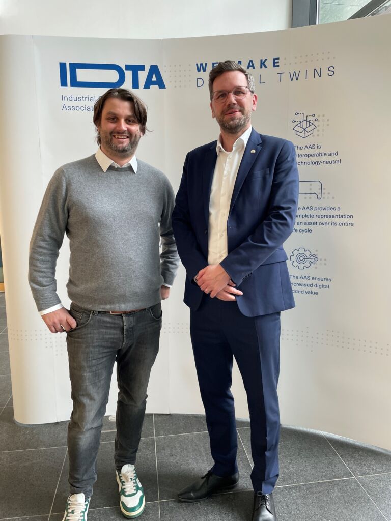 „Wir wollen unsere Expertise in die Weiterentwicklung der AAS einbringen, die sicher zum Standard werden“, sagt Business Development Manager Tobias Fuertjes (links). Meik Billmann, Geschäftsführer IDTA (rechts), fügt an, man sei überzeugt, dass die Lösungen von PTC wichtige Daten und Informationen für liefern.