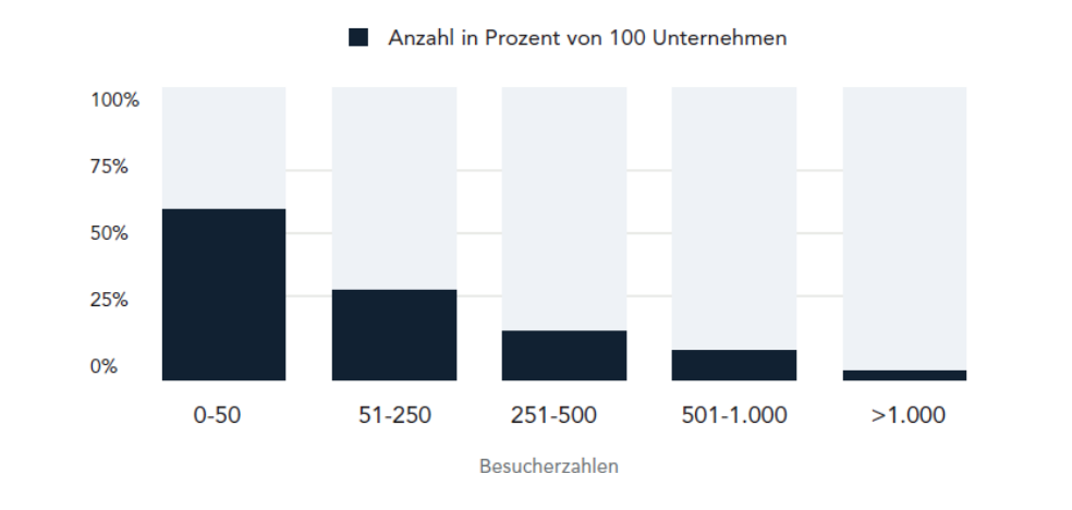Ein zentraler Bestandteil der Analyse war die Untersuchung der Besucherzahlen. Dabei wurden die monatlich Besucherzahlen mit Hilfe von ahrefs untersucht. Diese Daten geben Aufschluss darüber, wie erfolgreich die Unternehmen potenzielle Kunden online erreichen. Nur wenige Prozent der untersuchten Websites erreichen eine Besucherzahl mehr als 1.000 je Monat.