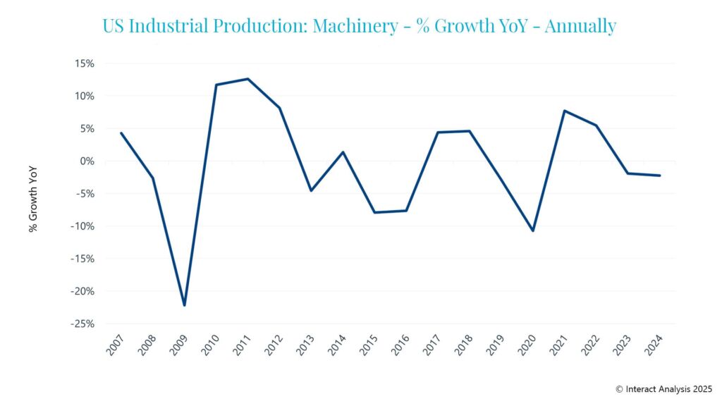 Zu Beginn des Jahres 2025 schien die Wirtschaft des verarbeitenden Gewerbes in den USA eine Phase des Abwartens hinter sich zu lassen. Die Präsidentschaftswahlen in den USA waren entschieden, die Inflation schien zu sinken, und weitere Zinssenkungen wurden erwartet. Vor den Zöllen von Präsident Trump war Interact Analysis zuversichtlich, dass die US-Märkte für industrielle Automatisierung im Jahr 2025 ein moderates Wachstum aufweisen würden. Es scheint jedoch, dass die Zeit des Abwartens durch Trumps weitreichende Zölle verlängert worden ist. Was nach einem Abschwung im Jahr 2024 wie ein Erholungsjahr für die Anbieter von Industrieautomation aussah, scheint nun nicht mehr sicher.