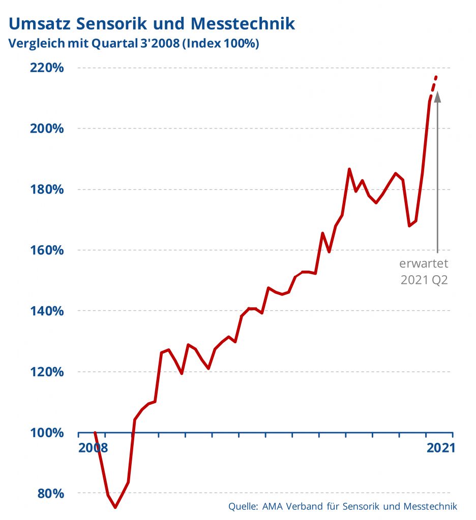Laut dem AMA Verband für Sensorik und Messtechnik hat die Branche im 1. Quartal 2021 ein Umsatzwachstum von 13% im Vergleich zum Vorquartal erzielt. Die Auftragseingänge stiegen zu Jahresbeginn um 7%. Die Branche ist positiv gestimmt und erwartet für das 2. Quartal ein weiteres, moderates Umsatzwachstum von 4%. Laut Bundesministerium für Wirtschaft und Energie schrumpfte die Wirtschaftsleistung im 1. Quartal 2021 insgesamt um 1,7%. Die Industrie war am Ende des 1. Quartals jedoch wieder aufwärtsgerichtet und die Auftragseingänge setzten diesen Aufwärtstrend fort, insbesondere durch eine steigende Inlandsnachfrage. Die Sensor- und Messtechnik-Hersteller melden deutlich positivere Entwicklungen für das 1. Quartal. Insbesondere die großen AMA-Mitglieder konnten im 1. Quartal die Umsätze steigern. Bei den Auftragseingängen punkten hingegen die kleinen und mittelständischen Branchenvertreter überdurchschnittlich, größere Unternehmen melden stabile Auftragseingänge. „Unsere Statistik zeigt, dass die Umsatzrückgänge aus der Corona-Krise inzwischen für einen Großteil unserer Branche ausgeglichen werden konnte“, sagt Thomas Simmons, Geschäftsführer des AMA Verband für Sensorik und Messtechnik. „Die Erwartungen unserer Mitglieder sind insgesamt positiv. Unterbrochene Lieferketten konnten den meisten Fällen durch alternative Lieferanten geschlossen werden. Die Entwicklung der Auftragseingänge unterstützt zudem die Aussicht auf ein sich normalisierendes Umsatzwachstum im laufenden Quartal.“