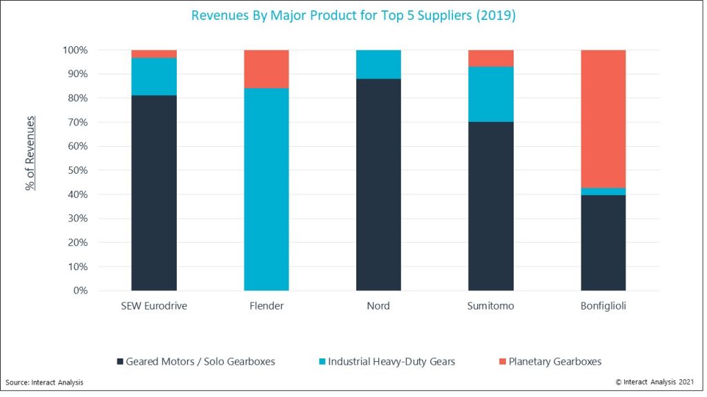 Europäische Anbieter sind in allen Bereichen des Getriebemarktes führend. 50% ist der Mindestanteil, den europäische Unternehmen in jedem Sektor halten. Im Gegensatz dazu halten US-amerikanische Unternehmen nur 8,5 bis 11% in jedem Segment, während chinesische Unternehmen über 30% des Marktes für schwere Industriegetriebe repräsentieren. Der Markt für Getriebemotoren/Sologetriebe hat einen Wert von 5,6Mrd.$, und wie beim Weltmarkt liegt SEW mit einem Marktanteil von 36% an erster Stelle. An zweiter Stelle steht Nord, ebenfalls mit einem zweistelligen Marktanteil von 11%, während Sumitomo mit 8% an dritter Stelle steht. Das Markt segment Schwerlast-Industriegetriebe hat einen Wert von 3,2 Mrd.$. Flender dominiert dort mit einem Marktanteil von 26%. SEW und und Sumitomo haben einen Anteil von 12% bzw. 4,5%. Das Segment der Planetengetriebemotoren/Sologetriebe hebt sich vom breiteren Markt für Getriebemotoren und Industriegetriebe ab, da er viel stärker fragmentiert und deutlich vielfältiger ist. Zwar gibt es immer noch einen Marktführer mit einem zweistelligen Marktanteil (Bonfiglioli, mit 13,5%), doch ist der Anteil des führenden Unternehmens weitaus geringer als in den anderen Bereichen. Auf den Plätzen zwei und drei folgen Dana Brevini mit 11% und Flender mit 9%. Darüber hinaus gibt es insgesamt 15 Anbieter mit Anteilen zwischen 2 und 4,5%.