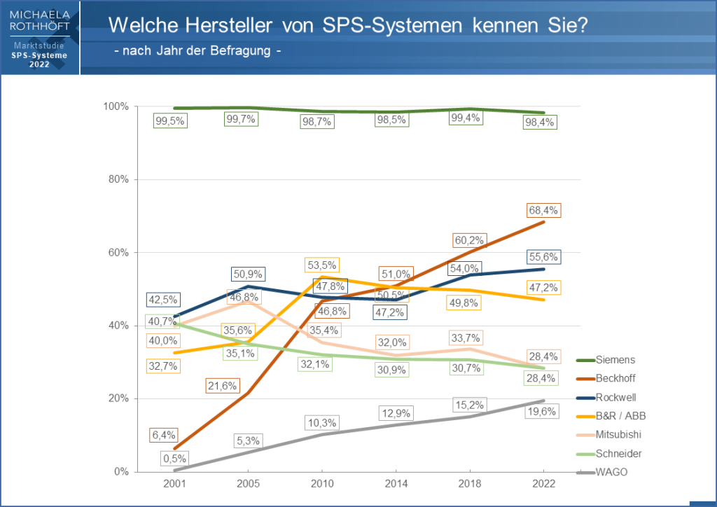 Der Markt für SPS-Systeme wird in Deutschland weiterhin von Siemens dominiert. So das Ergebnis der aktuellen Marktstudie ‚SPS-Systeme‘ von Michaela Rothhöft, die mit Unterstützung des VDMA durchgeführt wurde. Am stärksten entwickelt hat sich in den vergangenen Jahrzehnten Beckhoff: 2001 mit 6% noch weitgehend unbekannt, steht die Firma heute mit 68% an 2. Stelle des Bekanntheitsgrads. Diese Entwicklung zeigt, dass auch ein damals noch kleines Unternehmen (im Vergleich zu internationalen Konzernen) durchaus Chancen hat, in einem schwierigen Markt große Erfolge zu feiern. Im Rahmen dieser 6. Auflage der Studie gaben deutschlandweit über 250 Maschinenbauunternehmen Auskunft u.a. über das Einsatzverhalten im Bereich SPS-Systeme.