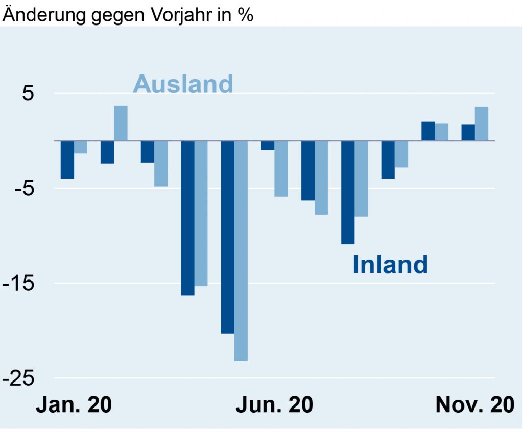 Der nominale Umsatz der heimischen Elektrofirmen ist im November 2020 um 2,7% gegenüber Vorjahr auf 17Mrd.€ geklettert. Bereits im Vormonat hatte es hier den ersten Anstieg seit Februar gegeben. Die Inlandserlöse erhöhten sich um 1,7% auf 8,3Mrd.€ und die Auslandserlöse um 3,6% auf 8,7Mrd.€. Während sich die Geschäfte mit der Eurozone um 9,1% auf 3,3Mrd.€ verbessern konnten, gab es beim Umsatz mit Drittländern nur ein kleines Plus von 0,4% auf 5,4Mrd.€. Im Gesamtzeitraum von Januar bis November 2020 beliefen sich die aggregierten Branchenerlöse auf 163,8Mrd.€, womit sie ihren Vorjahreswert um 6,2% verfehlten. Der Inlandsumsatz fiel hier um 5,8% auf 78Mrd.€ und der Auslandsumsatz um 6,6% auf 85,8Mrd.€. Die Erlöse mit Kunden aus dem Euroraum waren um 6,3% gegenüber Vorjahr auf 31,8Mrd.€ rückläufig.