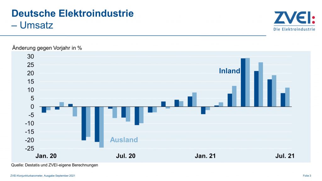 Von Januar bis einschließlich Juli dieses Jahres kamen die aggregierten Branchenerlöse auf 113,1Mrd.€, womit sie um 12% über Vorjahr lagen und auch ihr Niveau aus 2019 um knapp 3Mrd.€ übertreffen konnten. Der Inlandsumsatz zog in den ersten sieben Monaten 2021 um 10,4% gegenüber Vorjahr auf 52,7Mrd.€ an. Der Auslandsumsatz belief sich auf 60,4Mrd.€ und rückte damit um 13,5% vor. Mit Kunden aus dem Euroraum wurden 22Mrd.€ erlöst (+13,8%) und mit Drittländern 38,4Mrd.€ (+13,3%).