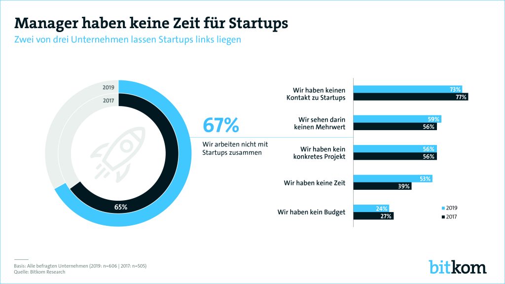 Mehr als jedes vierte deutsche Unternehmen ab 20 Mitarbeitern (27%) gibt aktuell an, dass aufstrebende Startups seine Marktstellung gefährden. Vor zwei Jahren waren es erst 18%. Dennoch arbeiten zwei Drittel der Unternehmen (67%) aktuell nicht mit Startups zusammen. Aber 63% schließen dazu Partnerschaften mit IT-Spezialisten. Rund jedes dritte Unternehmen (37%) setzt dazu auf eine Zusammenarbeit mit etablierten Unternehmen aus der eigenen oder anderen Nicht-Digital-Branchen. Das ist das Ergebnis einer repräsentativen Umfrage unter 606 Unternehmen aus allen Branchen im Auftrag des Digitalverbands Bitkom. Überraschend seien die Gründe, weshalb Unternehmen auf eine Zusammenarbeit mit Startups verzichten. So gibt jeder zweite der Geschäftsführer (53%) an, keine Zeit für Startup-Kooperationen zu haben. Vor zwei Jahren lag der Anteil mit 39% deutlich darunter. Rund drei Viertel (73%) nennen aktuell als Grund fehlende Kontakte zu Startups. Jeweils drei von fünf Unternehmen sagen, sie sehen keinen Mehrwert in einer Kooperation mit Startups (59%) bzw. es gebe kein geeignetes konkretes Projekt (56%). Nur jedes vierte Unternehmen beklagt fehlende finanzielle Mittel (24%).