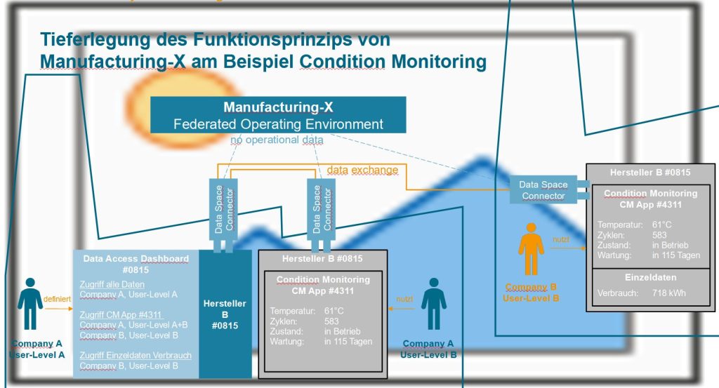 Wir benötigen also eine Alternative zu diesem Szenario: Ein föderatives Datenökosystem, mit dessen Hilfe wir Daten teilen können, ohne sie zu verlieren – und somit die Kundenschnittstelle weiterhin für uns reklamieren können. Die Unternehmen wollen die Freiheit, Daten mit ihren Partnern zu teilen – und nicht durch einen Staatsakt gezwungen zu werden. Um die Zukunft im B2B-Kontext tatkräftig anzugehen, um gemeinsam voranzukommen im Wettbewerb, um ausbalancierte Lösungen anzubieten, wurde der Ansatz von Manufacturing-X geboren: ein föderatives Datenökosystem, ein Data Space für die intelligent vernetzte Produktion. Im Zentrum der Idee steht die Verknüpfung aller Akteure abseits einer zentralen Plattform. Abseits des Payloads wird hierbei lediglich die Verbindung der involvierten Parteien hergestellt. Indem standardisierte Konnektoren genutzt werden, bleibt die Datensouveränität gewährleistet.