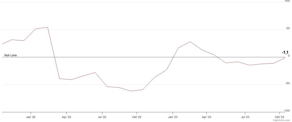 Die ZEW-Konjunkturerwartungen für Deutschland steigen in der aktuellen Umfrage vom Oktober deutlich an. Sie liegen mit minus 1,1 Punkten um 10,3 Punkte über dem Wert vom September. Darüber hinaus stabilisiert sich die Einschätzung der gegenwärtigen konjunkturellen Lage. Sie sinkt um 0,5 Punkte minimal und liegt aktuell bei minus 79,9 Punkten.