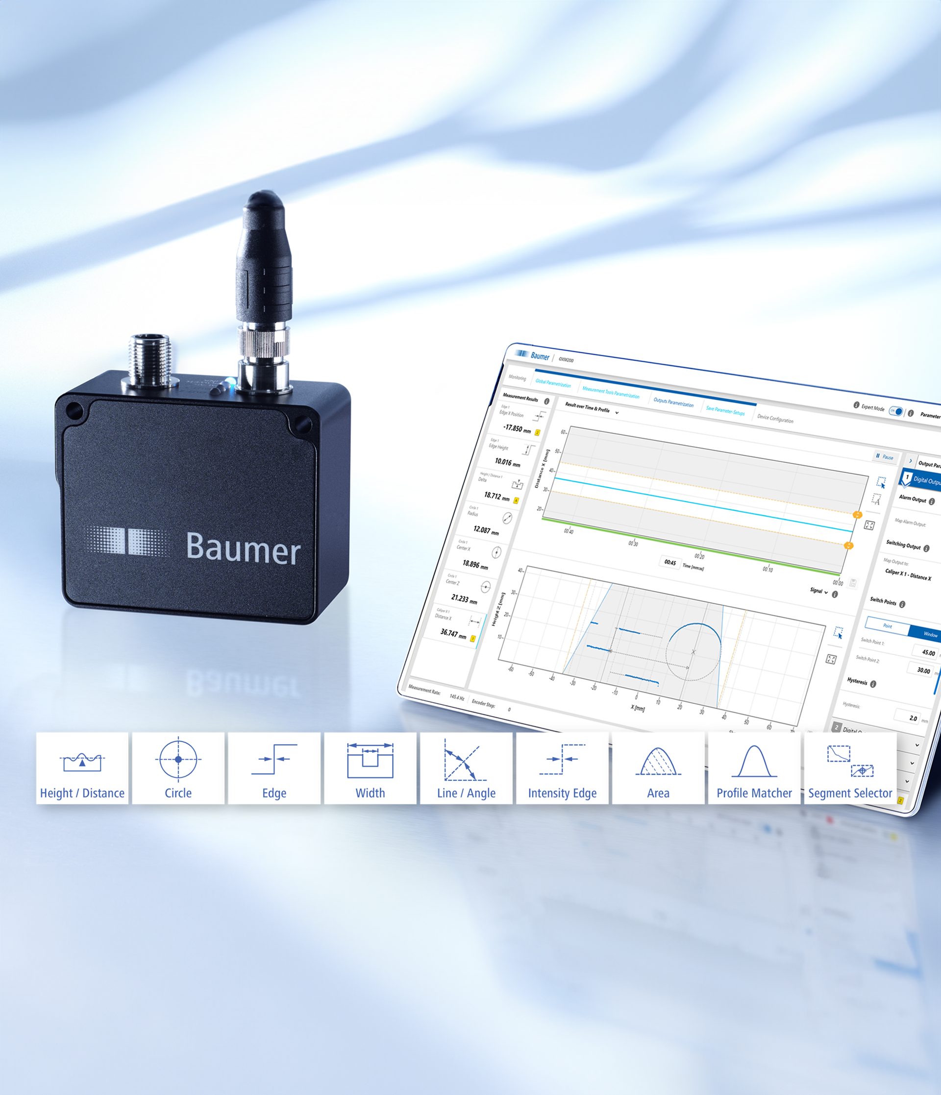 Mittels Profilanalyse können die smarten 2D-Profilsensoren der OX-Serie von Baumer eine Vielzahl an anspruchsvollen Positionier- und Inspektionsaufgaben lösen. Ein umfangreicher Satz an Werkzeugen ermöglicht die komplette Verarbeitung der Profildaten direkt im intelligenten Sensor. Ohne weitere externe Schritte übermittelt er den X/Z-Positionswert mit einer Präzision von bis zu 5µm an die Steuerung. Über das integrierte Webinterface können bis zu sieben Messwerkzeuge grafisch unterstützt frei konfiguriert werden.