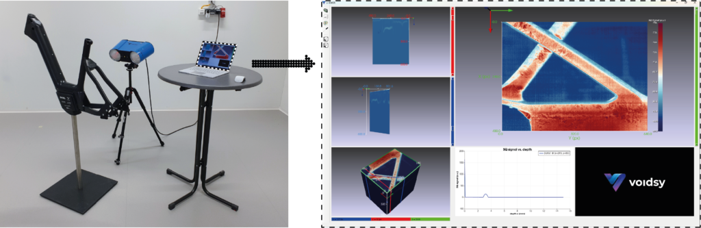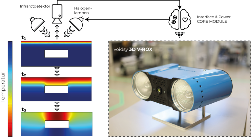 Aufgrund ihres geringen Gewichts und ihrer mechanischen Eigenschaften kommen, im Bereich der Luftfahrt, vermehrt moderne Verbundwerkstoffe, wie kohlefaserverstärkte Kunststoffe, zur Anwendung. Bei der Herstellung entsprechender Leichtbaukomponenten kommt es trotz ständig weiterentwickelter Fertigungsverfahren und -techniken zu unterschiedlichen Defekten. Zur Beurteilung der Qualität von sicherheitsrelevanten Luftfahrtbauteilen ist daher die zerstörungsfreie Prüfung unerlässlich, wobei aufgrund eines gesetzlichen Regulativs die 100%-Prüfung erzeugter Komponenten vorgeschrieben ist. Die aktive Thermografie stellt eine schnelle und großflächige Prüfmethode dar, welche die Basis für die Produktentwicklung von Voidsy liefert. Oftmals gilt die aktive Thermografie lediglich als qualitatives Prüfverfahren und setzt zur Ermittlung absoluter Fehlergrößen die Anwendung einer Sekundärprüfmethode, wie der Ultraschallprüfung voraus. An dieser Stelle tritt das 3D-V-Rox-System der österreichischen Firma in den Vordergrund.