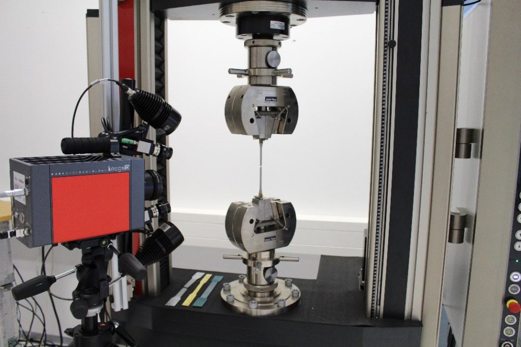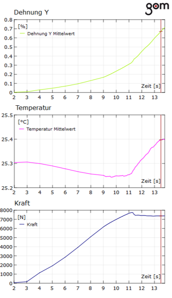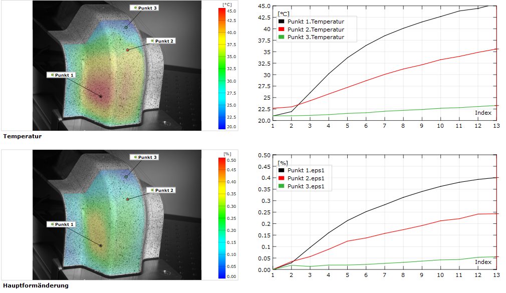 Beim quasistatischen Zugversuch ermöglicht die Kombination beider Messverfahren eine synchronisierte und ortsgebundene Analyse der Dehnungsergebnisse mit der Temperatur der Probenoberfläche. Während der Anfangsphase des Zugversuchs (elastischer Dehnungsbereich und kurz danach) lässt sich mithilfe der thermografischen Auswertung bei größer werdender Verformung eine Abkühlung der Probe aufgrund des thermoelastischen Effekts feststellen. Im weiteren Versuchsverlauf kommt es dagegen durch die Verformungsarbeit im plastischen Verformungsbereich zu einer stetigen Erwärmung der Probe bis hin zum Bruch. Auch im Bereich des Komponenten- bzw. Bauteilversuchs lassen sich das Gom-Aramis-System und Infrarotkameras von InfraTec in gleicher Weise anwenden, um Informationen über das thermische und mechanische Bauteilverhalten zu gewinnen, die zur Validierung von numerischen Simulationen herangezogen werden können.