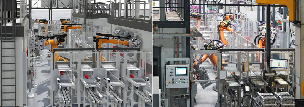 Um das Ziel der virtuellen Inbetriebnahme zu erreichen, nämlich den Aufbau eines weitgehend der physischen Anlage entsprechenden Modells, werden viele Informationen und Daten benötigt. Das reicht von den Anlagen-Layouts bis hin zu Technologie-Schemen der Förderelemente wie auch gegebenenfalls vollständige Roboter-Offline-Programme. Und das 3D-Modell muss in einem für die Simulationssoftware lesbaren Format zur Verfügung gestellt werden. Neben dem Handling großer Datenmengen stellt dabei die häufig fehlende Datendurchgängigkeit der verwendeten Systeme inklusive Informationsverluste und Medienbrüche eine Herausforderung dar. Dennoch ist es sinnvoll, bei der Erstellung digitaler Zwillinge auf bereits im Prozess vorhandenes Datenmaterial zurückzugreifen, da damit unter anderem enorme Zeitersparnisse einhergehen. Die effiziente Nutzung dieser Daten für die Modellerstellung hängt somit vom Funktionsumfang der verwendeten Simulationssoftware ab. „Einen weiteren wichtigen Optimierungsfaktor stellt die durchgängige Datenaufbereitung und -strukturierung während des gesamten Engineering-Prozesses dar“, fügt Meier hinzu. Sollten in einem frühen Stadium des Engineering-Prozesses noch keine für die Modellierung verwendbaren Daten vorliegen, wird zuerst ein idealisiertes Modell – etwa zur ersten Absicherung der SPS-Programmierung – aufgebaut, das im Laufe der Projektumsetzung immer detaillierter wird.