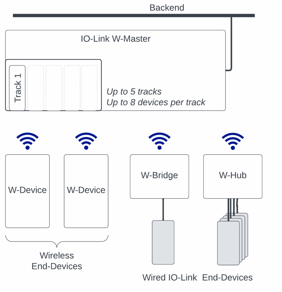 IO-Link Wireless arbeitet im nicht lizenzierten 2,4GHz-ISM-Band (Industrial, Scientific, Medical). Es kommuniziert mit GFSK-HF-Modulation (Gaussian Frequency Shift Keying), die aufgrund ihrer konstanten Hüllkurve immun gegenüber Metall- und Multi-Path-Fading-Effekte ist. Sie beschränkt die Emissionen auf ein schmales Spektralband und macht die Einrichtungen immuner gegen Rauschen und Störungen. Das Protokoll bietet eine Zuverlässigkeit von 10-9 Cycle Error Rate, was um mehrere Größenordnungen besser ist als bei anderen funkbasierten Standards wie WLAN, Zigbee und Bluetooth und der Zuverlässigkeit von Kabeln entspricht. Ein IO-Link-Master (W-Master) kann bis zu fünf Funk-Transceiver (Tracks) abdecken, die jeweils bis zu acht IO-Link-W-Devices unterstützen, so dass sich die Anzahl der Geräte pro W-Master auf bis zu 40 erhöht. Die W-Master-Tracks kommunizieren gleichzeitig auf verschiedenen Frequenzen und ermöglichen so eine optimale Netzauslastung. Bei größeren Netzwerken können mehrere IO-Link Wireless Master nebeneinander zum Einsatz kommen. IO-Link Wireless lässt sich auch als Nachrüstoption zu bestehenden kabelgebundenen IO-Link-Geräten hinzufügen, indem eine W-Bridge oder ein W-Hub verwendet wird. Das Protokoll ist so konzipiert, dass es durch ein adaptives Frequenzsprungverfahren mit anderen Funknetzen und Störern koexistiert. Der Kanalausschluss wird unterstützt, um mögliche Übertragungskollisionen mit anderen Funksystemen wie WiFi zu vermeiden. Der W-Master steuert den Sendezeitrahmen jedes W-Geräts und garantiert so einen fairen Anteil an der Funkbandbreite. Für kritische Daten wird ein integrierter Mechanismus zur automatisch erneuten Übertragung von Paketen verwendet, um hohe Zuverlässigkeit zu gewährleisten und die Latenz zu minimieren. Diese Funktion obliegt der physikalischen Schicht (PHY) der Funkeinheit. IO-Link Wireless wurde entwickelt, um eine deterministische Kommunikation zu ermöglichen. Dies wird durch die Einhaltung eines strikten Kommunikationszyklus (W-Cycle) und durch die Begrenzung der maximalen Anzahl funkbasierter Geräte, die von einem W-Master bedient werden können, gewährleistet. IO-Link Wireless bietet eine deterministische Latenzzeit von 5ms und unterstützt bis zu 40 Knoten (Sensoren, Aktoren oder I/O-Hubs) pro W-Master.