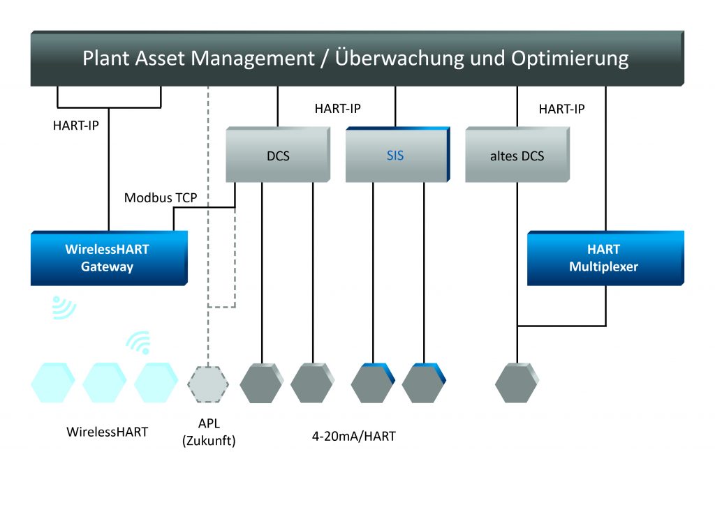 Mit der steigenden Bedeutung von Diagnosedaten und der wachsenden Digitalisierung der Feldebene in Prozessanlagen rückt HART-IP zunehmend in den Fokus von Anwendern und Systemanbietern. Es ermöglicht die vollständige und anlagenweite Integration von Lösungen in Großanlagen und bietet ein hohes Maß an Interoperabilität zwischen Geräten und Anwendungen. Das Protokoll läuft über IP-basierte Netzwerke wie Ethernet und Wireless LAN und arbeitet über UDP (User Datagram Protocol) und TCP (Transmission Control Protocol) mit IPv4 (Internet Protocol Version 4) oder IPv6. Die HART-IP-Anwendungsschicht basiert auf denselben Befehlen wie das 4 bis 20mA-basierte HART-Protokoll und wie WirelessHART. Im Gegensatz zur seriellen Datenübertragung können Prozess und IT-Daten über ein gemeinsames Medium übertragen werden. Es gibt einen großen Adressraum mit einer nahezu unbegrenzten Anzahl von Teilnehmern, darüber hinaus wird durch die Kaskadierung von Switches der Aufbau großer Netze möglich. Außerdem können größere Mengen an Daten effizient übertragen sowie verschiedene Übertragungsmedien (Kupfer, Glasfaser, Funk) kombiniert werden. Als High-Level-Applikationsprotokoll funktioniert HART-IP unabhängig vom Medium und kann sowohl mit Standard Ethernet (IEEE 802.3), mit Kupfer und Glasfaser, als auch mit Wireless LAN (IEEE 802.11) verwendet werden. Daher eignet es sich auch für den Einsatz mit gängigen Infrastrukturkomponenten wie LAN-Switches, Router, Access Points, Kabel und Stecker. HART-IP kann darüber hinaus bestehende Netzstrukturen mit redundanten Ethernet-Medien sowie Mesh-oder Ringstrukturen nutzen oder auch mit Power over Ethernet (PoE) betrieben werden. Außerdem unterstützt es unterschiedliche Geschwindigkeiten wie 10MBit/s, 100MBit/s und 1GBit/s. Mittels IP-basierter Kommunikation können mehrere Protokolle für verschiedene Anwendungen über das identische Netz laufen. Das heißt, HART-IP kann einfach mit anderen IT- und Industrial Ethernet-Protokollen, wie z.B. HTTP oder Ethernet/IP bzw. Profinet eingesetzt werden und benötigt keine spezielle Infrastruktur. Der Einsatz mehrerer Clients und Server wird ebenfalls unterstützt. Damit erhalten mehrere Steuerungen und Software-Anwendungen über dasselbe Netz Zugang zu Daten in einem oder mehreren Gateways oder Multiplexern. HART-IP lässt sich für Geräte mit Ethernet ebenso nutzen wie für HART-IP Backhaul-Netze in HART-Multiplexern. Es kann in Software zur intelligenten Geräteverwaltung innerhalb von Asset-Management-Systemen genauso wie in OPC-Servern zum Zugriff auf Daten aus 4 bis 20mA/HART-Feldgeräten eingesetzt werden. Spezialanwendungen, wie z.B. Software zur Überwachung von Kondensatableitern oder zur Zustandsüberwachung von Maschinen, verwenden heute bereits HART-IP für den Zugriff auf Gerätedaten. Für die Zukunft ist zu erwarten, dass Steuerungssysteme und Automatisierungslösungen HART-Daten über HART-IP liefern werden. Auch HART-IP-Geräte für eine nahtlose vertikale Integration in der Anlage sind denkbar. Bereits heute gibt es einige Geräte, wie z.B. Durchflussmesser, die Ethernet unterstützen. Viele Geräte in Prozessanlagen verfügen jedoch bisher über keine Ethernet-Anbindung und werden diese auch in absehbarer Zukunft nicht haben. Dazu gehören einfache Signalgeber, Analysegeräte oder Ventile. Es ist anzunehmen, dass diese Geräte weiterhin mit 4-20mA / HART, Feldbus oder WirelessHART arbeiten werden. HART-IP ist also noch kein Ersatz für diese Protokolle auf Geräteebene und eignet sich bisher dafür auch aus verschiedenen Gründen nicht: