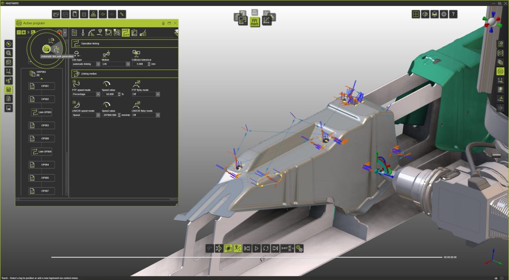 Das eliminiert das Ausprobieren, besonders bei komplexen Bauteilen. Durch voreingestellte Optimierparameter wird eine kollisionsfreie Bewegungsbahn sowohl innerhalb des Applikationsprozesses als auch bei den Bewegungen zwischen den Prozessen mit nur wenigen Klicks erstellt.