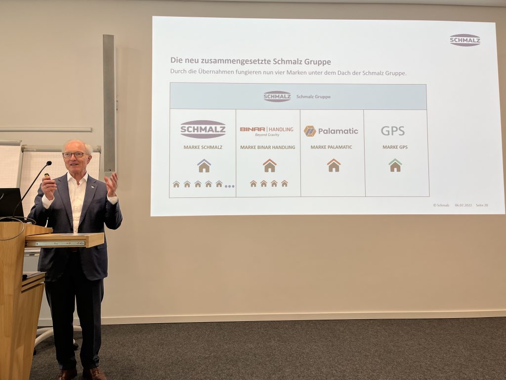Weltweit bringt es der Anbieter von Handhabungs- und Automatisierungstechnik derweil auf 23 Standorte. Produziert wird neben dem Stammsitz in Glatten auch in Indien, China, den USA und in Australien. Der Werksneubau im chinesischen Taicang wurde im März bezogen. Auch der große Ausbau des US-Standorts soll noch in diesem Jahr abgeschlossen werden. Neu in der Unternehmensgruppe sind Standorte im schwedischen Trollhättan sowie im englischen Chesterfield durch die Akquisitionen der Firmen Binar Handling und Palamatic. „Die Familie wird größer, das Portfolio breiter“, konstatiert der Schmalz-Chef. In beiden Fällen handle es sich um passende strategische Ergänzungen, „bei den Balancern von Binar Handling genauso wie beim Handling-Angebot von Palamatic für Chemie-, Pharma- und Reinraumanwendungen.“ Die zwei neuen Tochterfirmen sollen aber weiterhin eigenständig agieren und mit ihren Marken erhalten bleiben. „Unser Fokus liegt darauf, Prozesse zu synchronisieren, Wissen auszutauschen und sich gegenseitig bei der Expansion zu unterstützen.“
